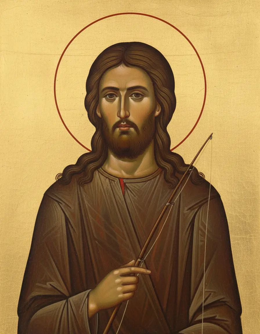 - Атрибуты — иногда в руках изображается свиток с молитвой или крест, реже — посох странника.